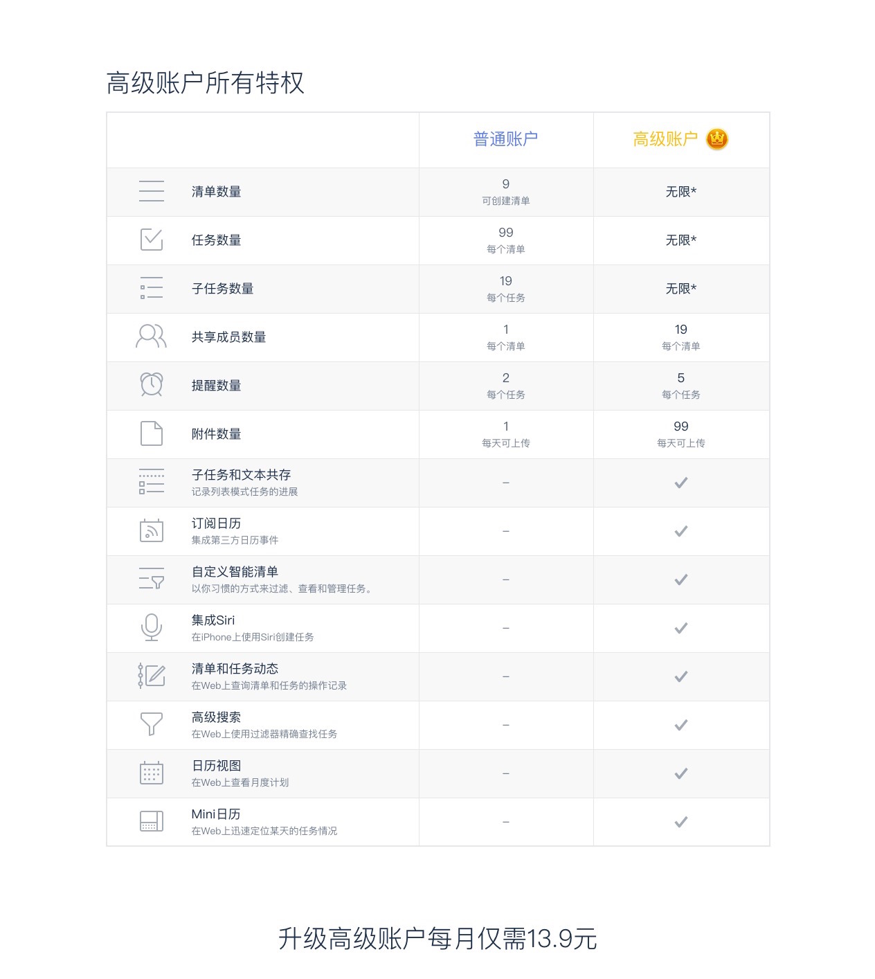 滴答清单高级帐户有诸多专享功能,能帮你更好的使用滴答清单,高级账户任意客户端购买后全平台通用。
